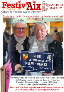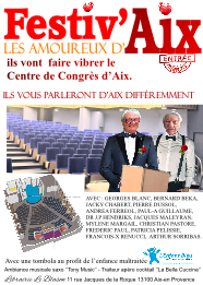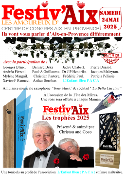 FESTIV'AIX :   Evénement qui célèbre l'âme créative et entrepreneuriale d'Aix. Mettre en lumière de jeunes artistes et associations, qu'ils soient auteurs-compositeurs, interprètes, peintres, musiciens, commerçants, artisans ou entrepreneurs. qui contribuent à façonner l'identité dynamique de la ville d'Aix-en-Provence.