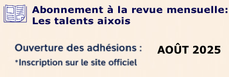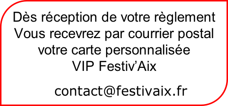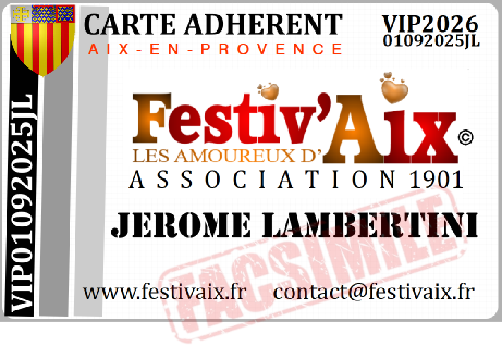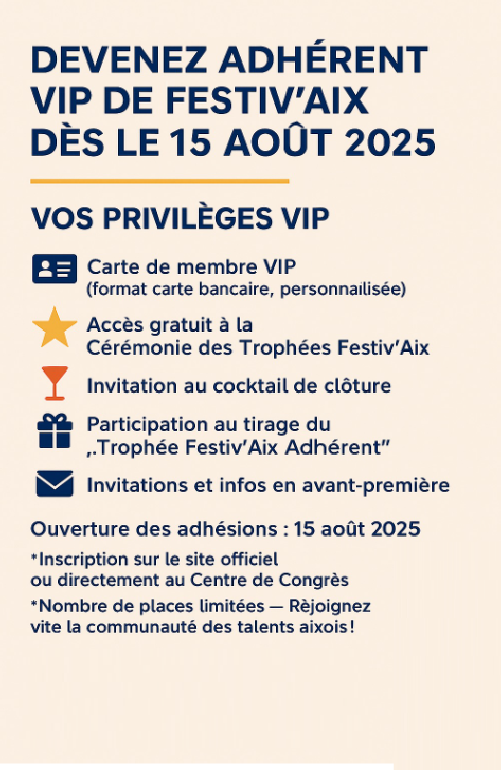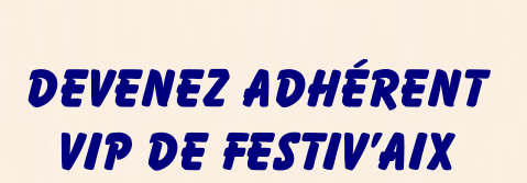 ACCUEIL PRESSE ADHESION HISTOIRE MECENAT LAUREAT LIEU TROPHEE INSC.2026 F'Aix 2025 F'AIX 2026  CONTACT INFO GALERIE OBJECTIF TOMBOLA A  D  H  E  R  E  N  T  S Adhérer à Festiv’Aix c’est rejoindre une communauté créative et engagée. En tant  que membre VIP, vous bénéficiez de privilèges exclusifs. Ou par Virement à FESTIV AIX Avec HELLO ASSOCIATION Cotisation annuelle adhésion 2025/2026  Du 01JAN2026 AU 31DEC2026 Adhésion membre 30€. Adhésion couple 50€ Membre bienfaiteur 100€. Partenariat 130€  & Dons +