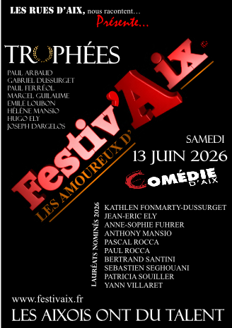 Le choix des nominés est désormais arrêté pour cette deuxième édition, et déjà l’émotion monte. Les trophées sont prêts, façonnés avec soin, et avec Coco et Frédéric nous apportons les toutes dernières touches à cet événement hors du commun. Cette édition sera plus qu’une célébration : un hommage vibrant à de belles personnes, à des talents authentiques du Pays d’Aix, à celles et ceux qui font rayonner notre territoire par leur créativité, leur générosité et leur engagement leur service. Festiv’Aix, c’est notre manière de dire merci, de mettre en lumière, de rassembler autour de ce qui nous unit : l’amour de notre ville, de sa culture, de ses voix multiples. À l’aube de 2026, nous vous adressons nos vœux les plus chaleureux. Que cette nouvelle année vous apporte douceur, inspiration et moments partagés. Passez de très belles fêtes de fin d’année, entourés de celles et ceux qui comptent.