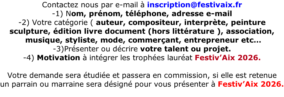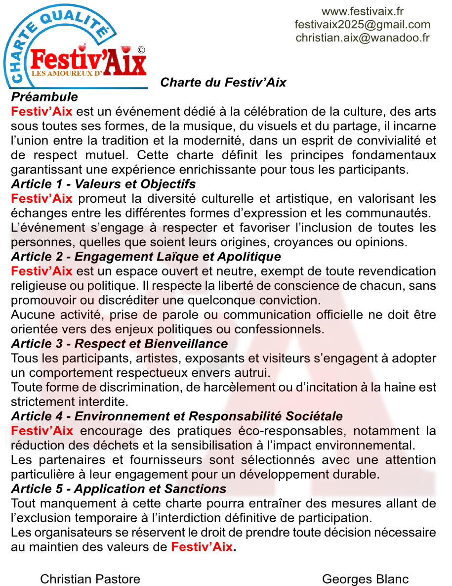 FESTIV'AIX : Evénement qui célèbre l'âme créative et entrepreneuriale d'Aix. Mettre en lumière de jeunes artistes et associations, qu'ils soient auteurs-compositeurs, interprètes, peintres, musiciens, commerçants, artisans ou entrepreneurs. qui contribuent à façonner l'identité dynamique de la ville d'Aix-en-Provence.
