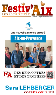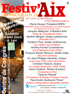 FESTIV'AIX :   Evénement qui célèbre l'âme créative et entrepreneuriale d'Aix. Mettre en lumière de jeunes artistes et associations, qu'ils soient auteurs-compositeurs, interprètes, peintres, musiciens, commerçants, artisans ou entrepreneurs. qui contribuent à façonner l'identité dynamique de la ville d'Aix-en-Provence.